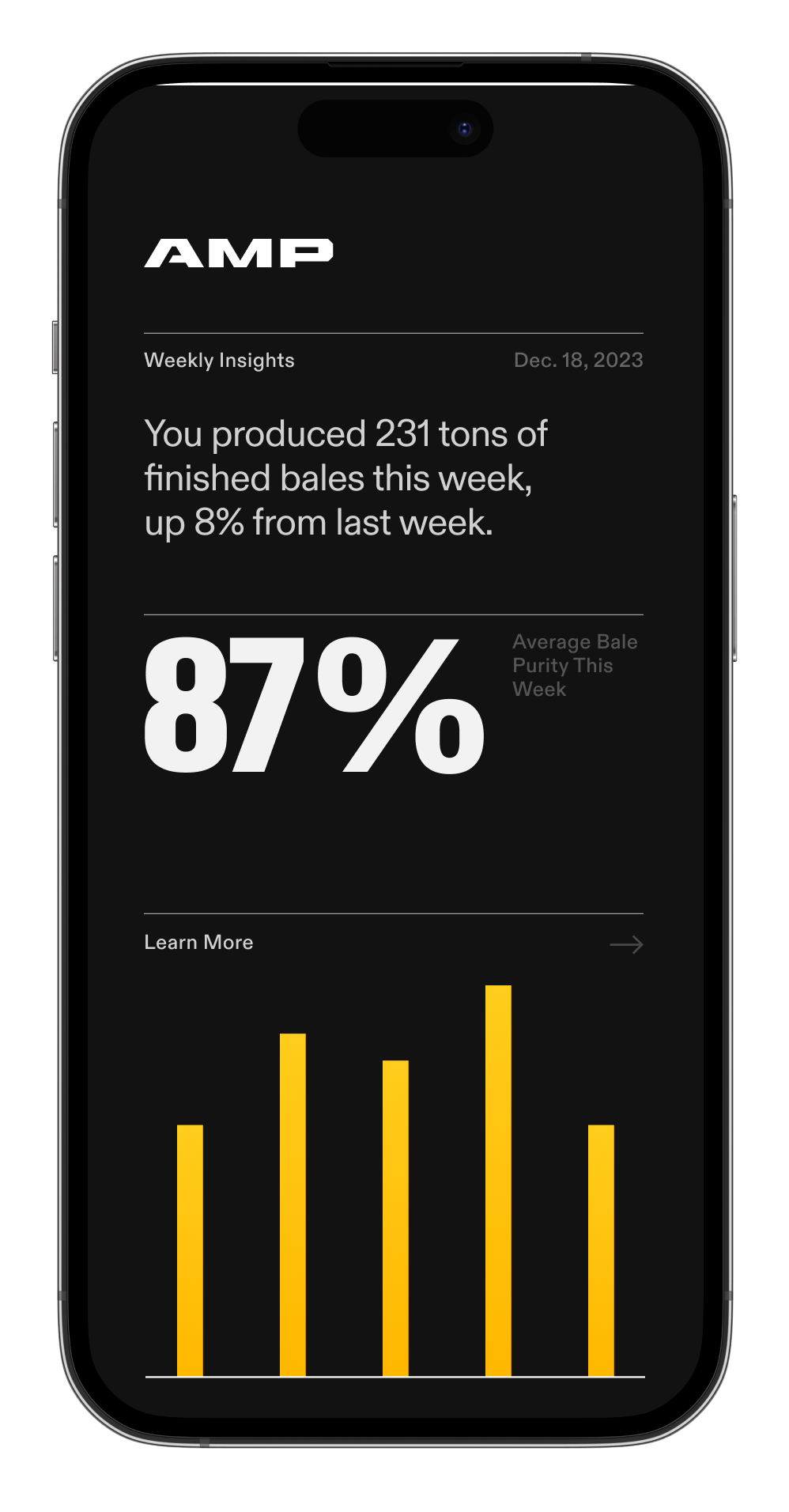All AMP technology includes Insight, with real-time performance data. Upgrade to Insight Premium (standard on AMP ONE) for real-time material stream characterization and composition and purity of finished bales.